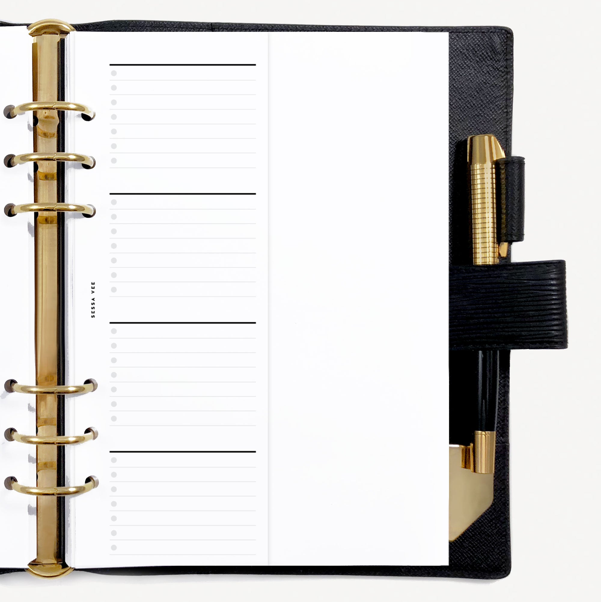 The above planner uses "Half Letter" inserts which are a bit taller and narrower than Sessa Vee A5 pages. (See below.)